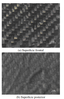 En la Figura 5 se muestran las superficies frontal y posterior de la lámina fabricada. La superficie frontal corresponde a aquella en contacto con el molde y la posterior, a la superficie sobre la cual se dispone el tejido pelable. En ambas se observan imperfecciones caracterizadas por discontinuidades en la matriz epoxi, originadas por el aire atrapado en el laminado, que produce peque ñas regiones carentes de resina. Se determinó que tanto la superficie frontal como la posterior, presentan una cantidad similar de imperfecciones de aproximadamente 8 porosidades/cm2.
