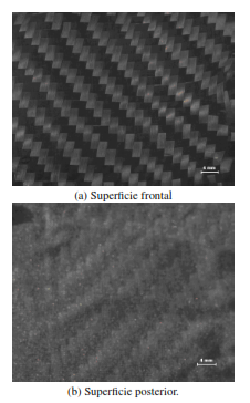 En la Figura 6, se observa la apariencia de las superficies frontal y posterior de la lámina de fibra de carbono-resina epoxi fabricada, presentando una calidad muy superior a la obtenida a través de la técnica de BV, con la ausencia total de imperfecciones para el aumento utilizado.