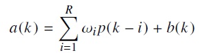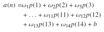 (1)Donde a(k) corresponde a la salida de la red neuronal, wi la matriz de pesos sinápticos, p(k) el patrón de entrada para el elemento i del TDL, es decir, la muestra retrasada y b(k) la polarización de la red. Para este caso, se realizó el desarrollo de la neurona, tomando R = 14 registros del TDL, siendo este modelo matemático el que se utilizó para la programación del comportamiento de la red en el micro-controlador (ver ecuación (2)).