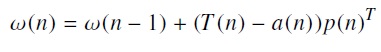 (3)Donde ω(n) será el valor del peso nuevo, a partir del peso anterior ω(n − 1), corregido en función de un coeficiente de aprendizaje por el error dado por la diferencia entre el target T(n) y la salida de la red a(n), en proporción de la entrada p(n).