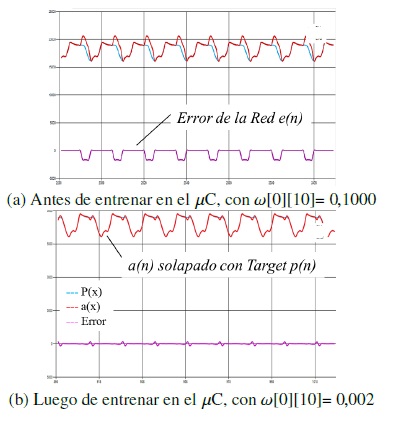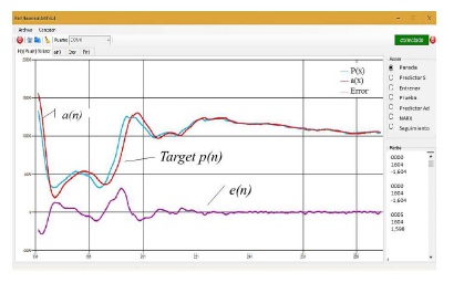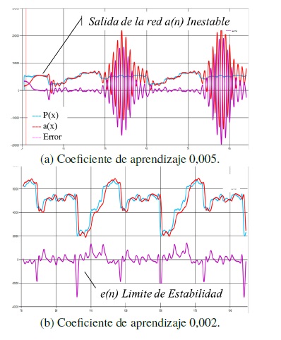 Se puede observar (Figura 12) que al seleccionar un coeficiente de aprendizaje mayor al límite de estabilidad (a) la respuesta del sistema se vuelve inestable, en tanto que el error oscila sin lograr converger a cero, se seleccionaron diversos coeficientes de aprendizaje obteniendo que el límite de estabilidad se obtiene con 0,002 (b), donde el error converge a cero, por tratarse de un predictor adaptativo al presentarse cambios en la señal de entrada p(n), el sistema debe reentrenar sobre el circuito obteniendo los nuevos valores de los parámetros, lo que explica las oscilaciones en los puntos de cambio.