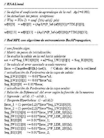 Para el módulo de control de posición de la celda fotovoltaica, se seleccionó una red multicapa, mediante una red hacia adelante (FeedForward). Se diseñó el control de posición para un panel fotovoltaico, el cual permitirá el seguimiento de la trayectoria del sol, se realizará la lectura de las tensiones respectivas usando LDRs (Light Dependent Resistor) y se definió un conjunto de patrones, basados en una prueba experimental. Se toman valores de entrada a la red referentes a tensiones de intensidad de radiación y la variable salida como la magnitud y sentido de giro dando una posición al servomotor, se ejecuta el cálculo de la inclinación más apropiada, el sistema fotovoltaico detecta el cambio de intensidad solar recibida y ajusta la posición en tiempo real. Por otra parte, se tiene la red lineal adaptativa, como predictor, de acuerdo a la salida del sistema en el tiempo, destacando que su implementación en circuito, aporta eficiencia al sistema híbrido de conversión de energía.