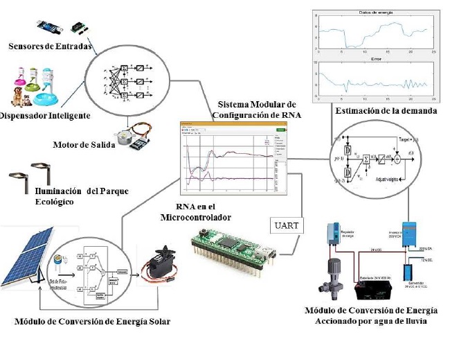 Algunos conceptos como diseño sostenible, Smart Grid [7], aplicaciones inteligentes en urbótica, sistemas eco-adaptativos [6], neuro-control en microredes de conversión de energías alternativas, aportan los avances en tecnología de redes neuronales aplicadas a energías renovables. El propósito de esta investigación es desarrollar un sistemas de control neuronal, basado en programación de microcontroladores en lenguaje C (versión libre de prueba), partiendo de conceptos de inteligencia artificial, como lo son las redes neuronales artificiales. Esto bajo criterios de control orientado a eficiencia energética, dadas las tendencias en energía renovables [8]. Es así como se propone un conjunto de funciones para un parque ecológico, definidas como: seguimiento de máxima eficiencia [5, 9]; un gestor de fuentes de energía, incorporando energía hidroeléctrica a pequeña escala, energía solar [4], estimación del consumo de energía [10] y predicción adaptativa, así como la automatización de un módulo dispensador de alimentos para la fauna del parque [11]. Tales ideas agregan la independencia y autonomía necesarias para mayor optimización de un sistema integrado.