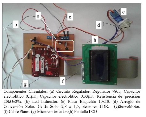 La implementación del hardware se llevó a cabo mediante un microcontrolador PIC de 32 bits a 40 MHz (20 MIPS). Los componentes: celda solar de calculadora, servo motor, regulador 7805, Capacitor electrolítico 0,1 µF, capacitor 0,3 µF, resistencia 20Ω, led indicador, pantalla LCD, etc. Se diseñó un prototipo de prueba para el control de posición de una celda fotovoltaica, tal como se presenta en la Figura 3.