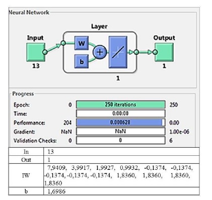 En la Figura 5 se presentan los resultados del diseño y parámetros de entrenamiento de la red neuronal lineal (13 entradas 1 salida para accionamiento de los mecanismos del dispensador). Es importante señalar que se seleccionó una salida correspondiente a un comando numérico, para establecer el accionamiento correspondiente, éste comprende el control de la electro-válvula de suministro de agua y el motor de paso de suministro de alimento, como funciones básicas.
