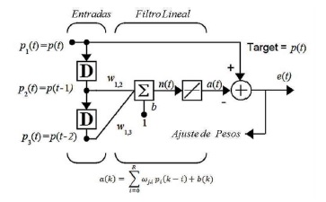 (2)Se utilizó el algoritmo de aprendizaje regla delta LMS para actualización de pesos sinápticos, dado por la expresión de la ecuación (3).