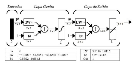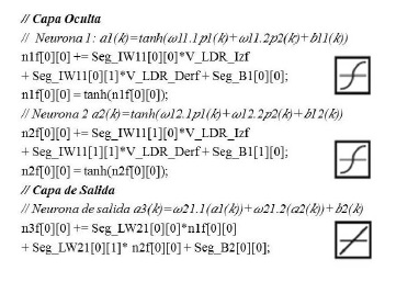 Se puede observar en las dos neuronas de la capa oculta la interacción de las entradas (señales del sensor LDR), para los pesos definidos en el esquema matricial MPL. Cada una de las salidas obtenidas en las neuronas de la capa oculta n1f y n2f (función de salida tangh), pasan a ser las entradas de la neurona n3f (con función de salida lineal) de la cada de salida de la red neuronal.