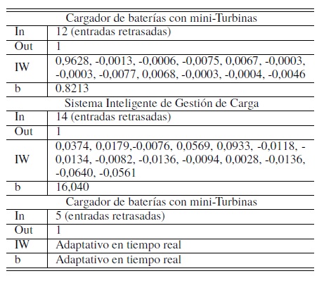 El siguiente módulo diseñado corresponde al predictor de la demanda para control para la configuración de los convertidores, donde se tiene la posibilidad de alimentar el parque ecológico, por una turbina accionada por un sistema de tanques que gestionan el agua de lluvia capturada y se emplea en los casos que la red tenga requerimientos adicionales. Este subsistema se encarga de monitorear la carga de las baterías, a través del voltaje en sus terminales. La condición para un voltaje superior a 26,6 VDC implica un cierre en la válvula que permite el flujo de agua por la mini-Turbina, la cual aprovecha el flujo y la presión del agua para generar electricidad (24 VDC). El sistema predictor del consumo del parque es utilizado para determinar el consumo general del parque, durante las 24 horas del día, mediante un predictor adaptativo con una memoria o TDL de 5 retrasos. El sistema determina mediante datos de consumo promedio de potencia, la conexión eléctrica más favorable para mantener una reserva de energía importante almacenada.