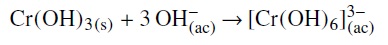 (3)El hidróxido de cromo (III), presenta una constante de producto de solubilidad (kps) a 25 °C de 7,0×10-31[10], sin embargo al final de la reacción se obtuvo una cantidad considerable cromo (Tabla 3), para una eficiencia de remoción del 92,54 %, este remanente se puede deber posiblemente a la baja conversión del cromo (VI) a cromo (III), mediante el tratamiento con azúcar, por lo que sería recomendable usar otro tipo de agente reductor para este fin (como el sulfato ferroso, FeSO4). Otro factor, que pudo haber influenciado el proceso es la naturaleza anfótera del cromo, el cual a valores de pH en el rango de 7 – 8 se comportan como un ácido débil [11], y se convierte en un anión, de acuerdo a la ecuación: