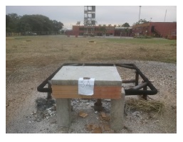El ensayo de exposición al fuego se llevó a cabo utilizando uno de los simuladores ubicados en el campo de prueba del Cuartel General de los Bomberos de Valencia, estado Carabobo, alimentado por gas metano. Una vez separada cada franja de losa, se procedió a colocarla sobre apoyos de concreto, simulando un elemento simplemente apoyado, colocado a un lateral del simulador, cerca de la boca de salida del gas, como se muestra en la Figura 3.