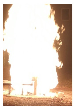A la edad de 28 días, se procedió a realizar los ensayos en el Campo de Prueba de la Estación Central del Cuerpo de Bomberos de Valencia. El ensayo consistió en la exposición de los modelos de losa a fuego directo fuego, por un lapso de tiempo de 60 minutos para cada ensayo, este tiempo fue seleccionado de acuerdo a lo establecido en el documento Seguridad frente al fuego de estructuras de hormigón de Vega y Buron [4]. De acuerdo a estos autores, para 60 minutos la temperatura alcanzada para un recubrimiento de 3 cm se estima en 370°C, mientras que para temperaturas de 400°C se estima en 15 % la perdida de resistencia del acero de refuerzo.