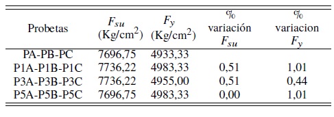 En la Tabla 1 se presentan los valores promedios obtenidos para los esfuerzos máximos y de fluencia, observándose que las probetas expuestas directamente al fuego (PAQ,PBQ y PCQ) presentaron una disminución de 14,19 % del esfuerzo máximo y de un 6,96 % del esfuerzo de fluencia con respecto a la muestra patrón (probetas PA,PB y PC). Por otro lado las probetas embutidas en las losas no sufrieron ninguna variación significativa en dichas propiedades mecánicas.