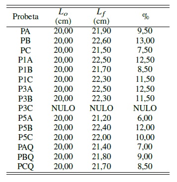 Otra característica estudiada correspondió al porcentaje de alargamiento, el cual se muestra en la Tabla 2 para cada una de las barras ensayadas. Estos resultados evidencian que las probetas PB, P1A, P3A y P5B cumplen con el porcentaje mínimo de alargamiento del 12 % referido en la Norma COVENIN 316:2000, para una longitud entre marcas de 200 mm incluyendo la zona de estricción; mientras que el Reglamento técnico dominicano RTD 458 [7] establece un porcentaje mínimo de alargamiento entre 20 marcas incluyendo la estricción de la barra de 9 %, no aceptado para las barras PAQ y PCQ.