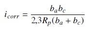 Mediante la ecuación (4) y sustituyendo el valor de alguna de las pendientes de Tafel en la ecuación (5), se obtiene el punto de intersección de ambas pendientes, que representará el valor de la corriente de corrosión.