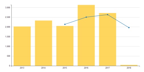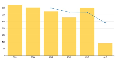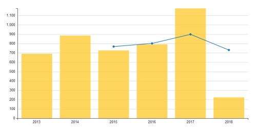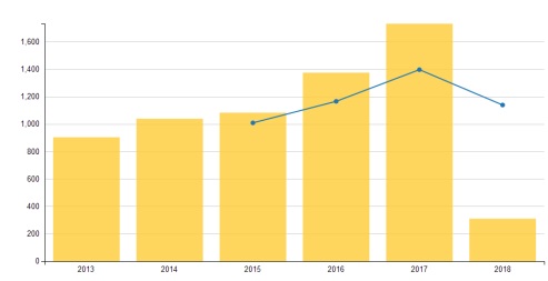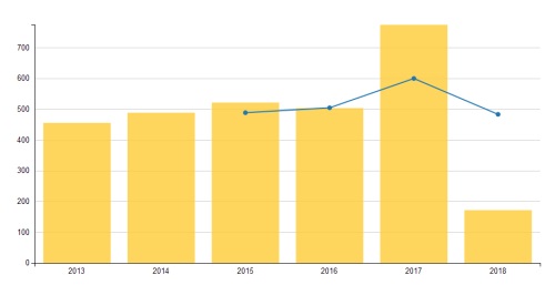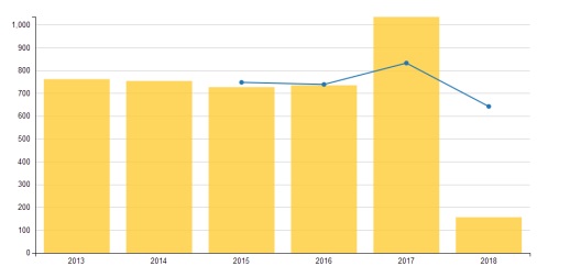 El crecimiento ha sido sostenido desde año 2013 hasta el 2017, registrándose un máximo de publicaciones de patentes en ese último período, el cual coincide con una disminución en los precios de la colofonia de goma sin modificar, la Figura 5 muestra esta tendencia.