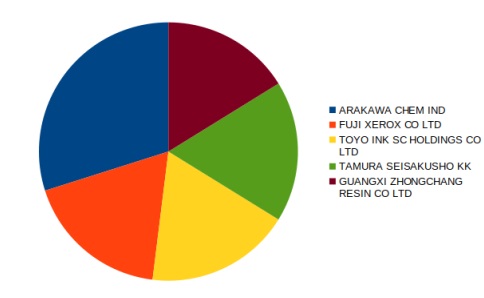 La compañía con una mayor cantidad de publicaciones de patentes en los últimos 5 años, es ARAKAWA CHEMICAL INDUSTRIES, LTD. La sede principal está ubicada en Japón y cuenta con una trayectoria de procesamiento y modificación de colofonia desde su establecimiento en el año 1876. Ésta ha evolucionado hasta alcanzar el establecimiento de bases manufactureras en China, Taiwan, Tailandia, Alemania y Estados Unidos. Fabrican materiales intermedios para uso industrial bajo cuatro líneas de producción: Químicos para producción de papel, Productos químicos de revestimiento y Materiales adhesivos (resinas para tintas, adhesivos de uso común y sensibles a la presión), y Materiales funcionales en el área de Materiales electrónicos (agentes de limpieza y sistemas para componentes electrónicos, soldadura aplicable a esos componentes y materiales de revestimiento para dispositivos). Trabaja con materia prima de origen Chino y controlan más de la mitad de la importación de colofonia en Japón. Arakawa Chemical desarrolló la primera colofonia casi incolora y transparente del mundo. Debido a que las cantidades de impurezas son muy pequeñas en comparación con la colofonia normal, ésta se usa como componente adherente en aplicaciones médicas.