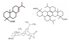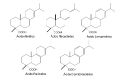 La colofonia es una mezcla de ácidos orgánicos de alto peso molecular y otros materiales neutros relacionados. Los constituyentes ácidos, conocidos como ácidos resínicos, se muestra en la Figura 2, estos componen el 90 % de la colofonia, son ácidos monocarboxílicos de núcleo fenantrénico alquilado [1].