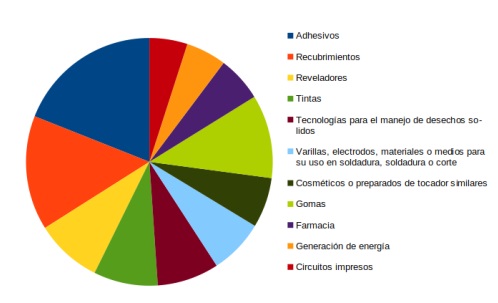 Resumen: Venezuela cuenta con grandes extensiones de Pino Caribe, que constituyen una fuente de especialidades químicas de origen natural. La colofonia, residuo de la destilación de la resina del pino, es una mezcla de isómeros diterpénicos, cuya funcionalización le confiere propiedades interesantes en la formulación de una amplia gama de bienes de uso común, intermediarios de polimerización y productos químicos. Con la finalidad de impulsar el aprovechamiento integral del pino venezolano y la diversificación de productos de nuestra industria forestal, se realizó un estudio donde se evalúa la tendencia mundial en la aplicación de la colofonia y sus derivados, mediante el análisis de los documentos de patentes publicados en el período desde el año 2013 hasta el primer cuatrimestre del 2018. Para ello se utilizó la plataforma de búsqueda de patentes PatentInspiration, aplicando una metodología de búsqueda sistemática, constituida por el diseño de una ecuación de búsqueda, la aplicación de filtros por el código de clasificación internacional de patentes, seguida de la generación y análisis de indicadores patentométricos, encontrándose que durante el período evaluado, las aplicaciones más destacadas la manufactura de adhesivos, recubrimientos, tintas, reveladores de imagen, circuitos impresos, elementos de soldadura o corte, gomas y farmacia.