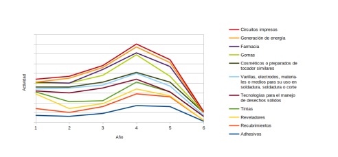 Si evaluamos la actividad en publicación de patentes en cada área por año tal y como se presenta en la Figura 7, podemos observar que del año 2013 al 2015 la aplicación de los derivados de la colofonia presentaba un incremento lento. Sin embargo, entre los años 2016 y 2017, se evidencia un aumento más pronunciado como consecuencia de la disminución de los precios en los puertos del mayor exportador de colofonia sin modificar (China). Esto impactó favorablemente, llevando al desarrollo de nuevos compuestos con características de desempeño mejoradas y la inclusión de la colofonia y sus derivados en una mayor cantidad de formulaciones de bienes de consumo.