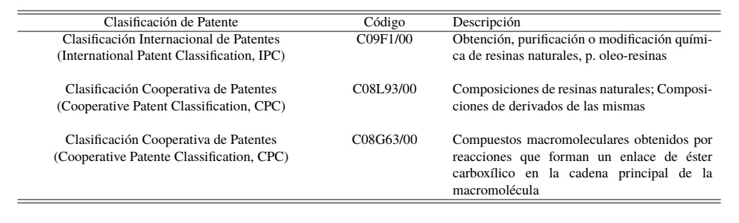 se excluyeron las patentes que incluyeran los códigos IPC C09F1/00, CPC C08L93/00 y CPC C08G63/00, cuya descripción se muestra en la Tabla 1;