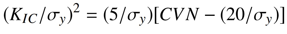 Existen ciertas relaciones empíricas entre los valores de KIC y CVN han sido propuestas en base a los resultados de diferentes investigaciones Barson et al. [11] observaron que el efecto de la temperatura y la velocidad de carga en los valores de CVN y KIC son las mismas, las cuales sugieren la posibilidad de establecer ciertas relaciones empíricas entre los resultados de estos dos ensayos.La relación propuesta por Barson et al., [11] es la siguiente: