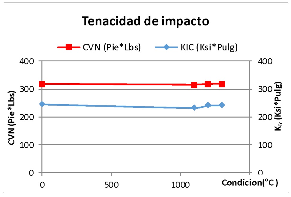 La tenacidad de impacto, para los tratamientos térmicos de recocido realizados a 1100°C y 1200°C se observa una leve disminución de la tenacidad de impacto al ser comparada con la con la condición original, mientras que a 1300 °C se efectúa una pequeña recuperación de su capacidad de absorber energía.°C
