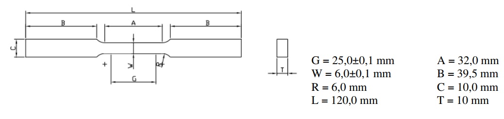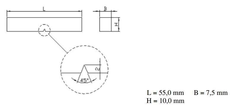 El mecanizado de las probetas fue realizado a través de corte por chorro de agua y corte por electroerosión por hilo, las probetas fueron maquinadas acorde con las normas ASTM A -370 [8] para el ensayo de tracción y ASTM E-23 [9]. Para el ensayo de impacto Charpy, tipo sub-size. Las dimensiones de las probetas se especifican en las Figuras 1 y 2.
