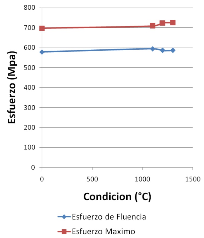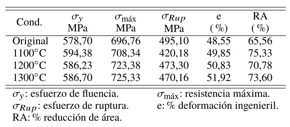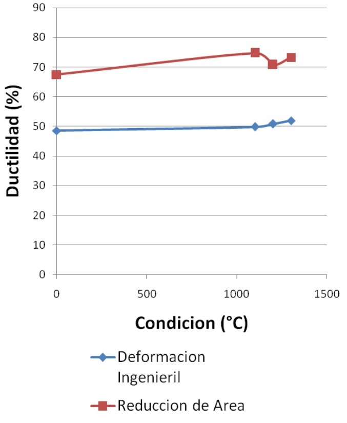 No hubo cambios significativos en la resistencia mecánica, ni en la ductilidad del acero inoxidable dúplex, ya que los cambios observados no superaron un mínimo de 10 % de variación, aun cuando el esfuerzo máximo tuvo un leve aumento en las condiciones de 1100 °C, 1200 °C y 1300 °C con respecto a la condición original.
