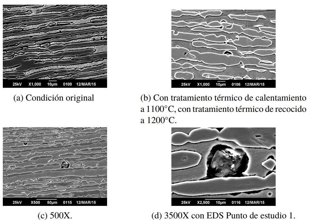 En la Figura 5 se observan por microscopia electrónica de barrido las microestructura del acero inoxidable Dúplex SAF 2304 en: Figura 5a la condición original, formada por ferrita y austenita (islas) típica de los aceros doble fase. En la Figura 5b se observa la microestructura del acero en la condición con tratamiento térmico de calentamiento a 1100°C, donde se observa precipitado, crecimiento de grano de la fase austenita. En la Figura 5c la condición es con tratamiento térmico de recocido a 1200ºC a 500X donde se observan precipitados entre la intercara ferrita- austenita y los granos direccionados en el sentido de fabricación. En la Figura 5d se toma de la Figura 5c a 3500X con EDS un Punto de estudio 1 [10]. Para determinar la composición el punto de estudio de la figura 5d se realizó el EDS en punto 1 de la fotomicrografía Figura 5 [10]. Encontrándose los resultados reportados en la Tabla 3, lo que determinó la presencia de un nitruro de cromo.