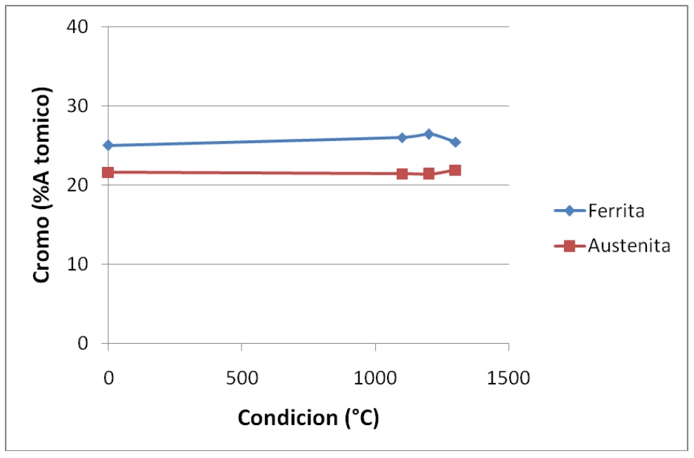 En la Figura 7 se observa que hay una tendencia a aumentar el porcentaje de Cromo en la fase ferrita desde la condición original hasta la condición de 1200 °C pero en la condición de 1300 °C sufre una decaída pero se mantiene por encima del valor de la condición original con un porcentaje de 2 %, algo similar pasa con la austenita con la diferencia que el porcentaje de Cromo disminuye en las condiciones de 1100 °C y 1200 °C y sufre un aumento de 2 %; para el elemento Níquel se puede observar en la Figura 6 La tendencia decreciente que experimenta este elemento en la fase ferrita a medida que aumenta la temperatura, mientras que en la austenita tiende a aumentar entre la condición original y las temperaturas de 1100 °C y 1200 °C, a 1300 °C. Este cambio indica que el elemento Níquel está migrando, de la fase Ferrita a la austenita, debilitando la fase ferritica. Al detallar la Tabla 4 se evidencia la presencia de inclusiones de óxido de aluminio, así como, un precipitado (Nitruro) en la condición de 1200°C, además, se observa la migración de los elementos Cr y Ni. Cabe destacar que el elemento Molibdeno solo se encontró presente en la condición original del material y la condición de 1100°C.