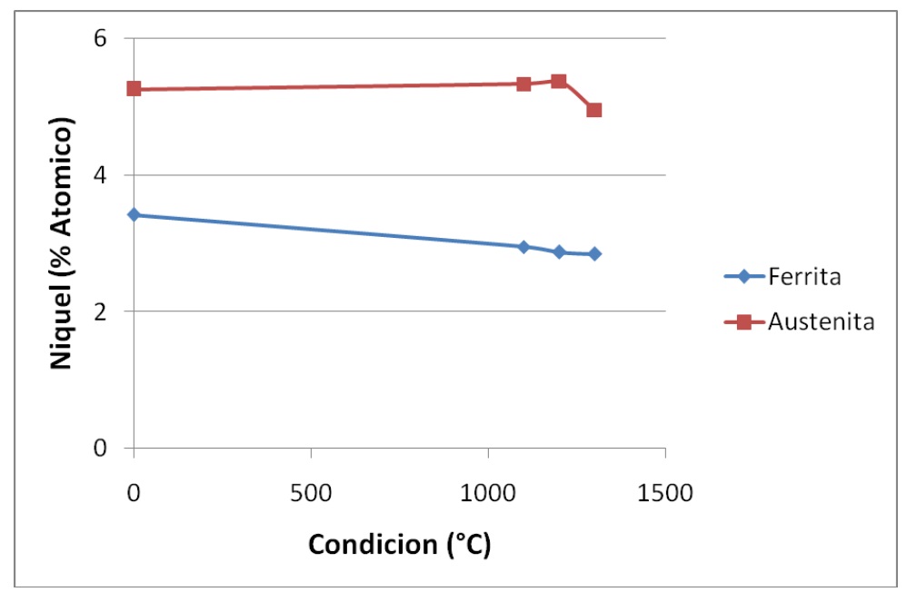 En la Tabla 5 se observa que la austenita es la fase que tiene el mayor porcentaje de Níquel tanto para la condición original como para las condiciones de recocido, la ferrita se observa que tiene el mayor porcentaje de Cromo en todas las condiciones investigadas.