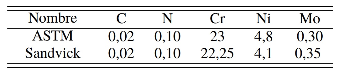 El material usado es un acero inoxidable dúplex SAF 2304, la composición química, se muestra en la Tabla 1.