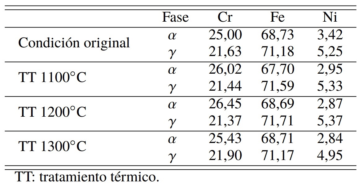 Se observó a través de EDS un incremento del tamaño de grano y una distribución más homogénea de las fases presentes durante el tratamiento y, se reveló la presencia de inclusiones con alta proporción de Aluminio, Cromo y otros elementos. Se determinó por EDS la migración del Níquel de la fase ferrita a la fase austenita, que provocó el endurecimiento de la ferrita generando la fragilización de la fase ferrita en las muestras tratadas térmicamente.