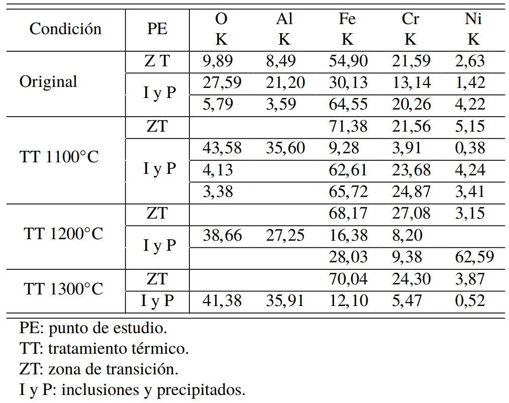 En las Tablas 4 y 5 se presentan los análisis por EDS determinados para cada una de las fases presentes en las diferentes condiciones de la investigación, así como de las zonas de transición y puntos de contaminantes (inclusiones y precipitados) del acero dúplex estudiado.
