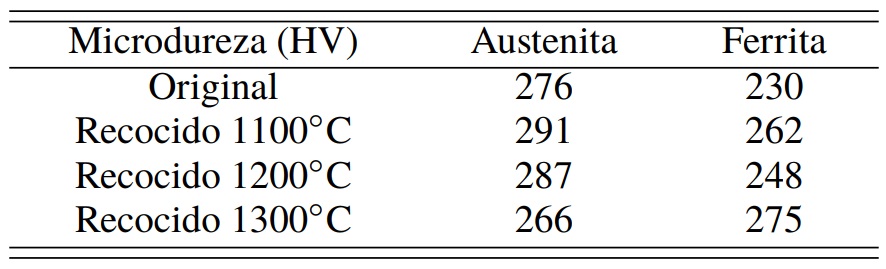 La micro dureza Vickers evidenció que para la fase ferrita ocurre un incremento en la dureza para las tres condiciones aplicadas de tratamiento térmico al ser comparado con la condición original. Para las condiciones de 1100 °C y 1300 °C se observa un incremento del 12,14 % y 16,24 % respectivamente mientras que en la condición de tratamiento térmico de 1200 °C se observa un cambio de 7,38 %. Para la fase austenita hay un incremento para las condiciones de 1100 °C y 1200 °C comparados con la condición original mientras que en 1300 °C decae respecto a la condición original.