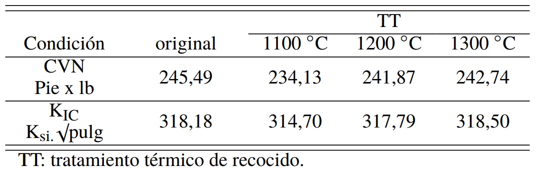 Mediante la relación empírica (ecuación (1)) propuesta por Rolfe, Novack y Barson [11], se procedió a determinar el factor de intensidad de esfuerzo KIC en la Tabla 7 y Figura 9, se muestran los valores obtenidos del ensayo. No hay cambios resaltantes en los valores obtenidos de CVN y KIC se puede decir que permanece constantes el tratamiento térmico realizado a 1100, 1200 y 1300 °C, no afectó el acero inoxidable dúplex.
