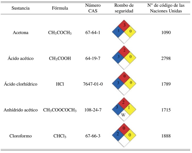 En esta fase de la investigación se clasificaron todas las sustancias químicas orgánicas e inorgánicas que se utilizan en las prácticas de ambos laboratorios. En dicha clasificación se indica el número de cas, rombo de seguridad y el número de las naciones unidas. Las Tablas 1 y 2 muestran algunas de las sustancias que se emplean en los laboratorios de estudio.
