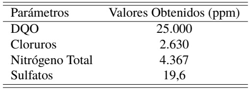 Al comparar los resultados obtenidos con los indicados en el Decreto, se evidencia que el valor del DQO (Demanda Química de Oxígeno) está muy elevado, ya que el límite máximo permitido es de 350. En cuanto a los cloruros el valor máximo es de 1.000 ppm y el obtenido fue 2.630 ppm, observándose que tampoco se encuentra dentro del límite permitido. Siguiendo el mismo orden de ideas para el Nitrógeno Total, el valor máximo permitido es 10 ppm y el obtenido es 4.367 ppm, comprobando que no cumple con lo establecido en el Decreto; y por último sabiendo que el límite máximo permitido para sulfatos es de 600 ppm y el obtenido fue de 19,6 ppm, se evidencia que éste si se encuentra dentro del parámetro establecido por la ley.