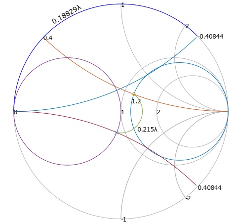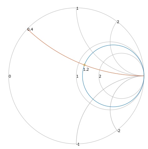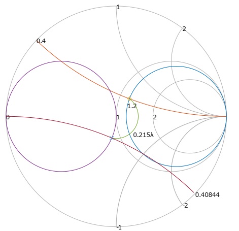 En la Figura 3 se muestran el círculo de resistencia normalizada iso-1.2, el arco de reactancia normalizada iso-0.4 y, en la intersección de estos, .