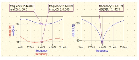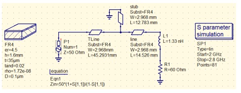 El circuito resultante está compuesto de la carga ZL, la red de adaptación diseñada en el Apartado 3.1 con la ayuda de la carta de Smith, una línea de transmisión de 50 Ω de impedancia característica y un generador con una impedancia de fuente igualmente de 50 Ω, tal como se muestra en la Figura 7. Las líneas de transmisión de la Figura 7 han sido diseñadas para un sustrato FR4 usando la herramienta de cálculo correspondiente disponible en el menú de Herramientas de QucsStudio.