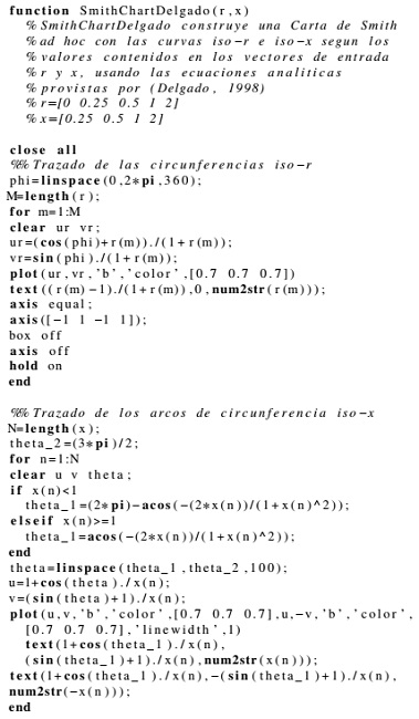 Usando las ecuaciones desde (7) a (14) hemos escrito en GNU Octave la function SmithChartDelgado(r,x) que traza tantas curvas iso-r e iso-x cuanto se indiquen, y cuyo script hemos transcrito en el Apéndice 1 para fines didácticos.