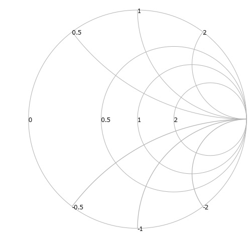 El dibujo de cierto número de miembros de estas familias de curvas dentro del círculo de radio unitario del plano complejo de da lugar a la carta de Smith. En la Figura 1 se muestra una carta de Smith de impedancias simplificada obtenida con la función SmithChartDelgado([0 0.5 1 2],[0.5 1 2]) (ver Apéndice 1)