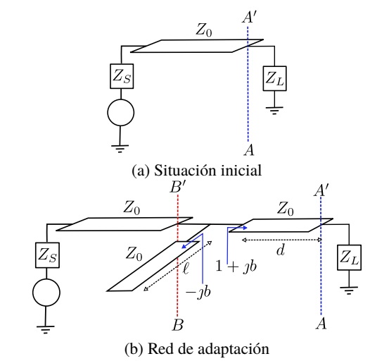 Situación inicial: se tiene una línea de transmisión de impedancia característica Z0 conectada a una impedancia de carga ZL, siendo ZL distinta de Z0, como se ilustra en la Figura 2a. En el problema de adaptación con un stub se plantea como meta convertir ZL en el plano en Z0 en el plano tal como se muestra en la Figura 2b. Para ello se ha de incorporar una red de adaptación compuesta por un tramo de L. de T. de longitud d en serie y por un stub en paralelo cortado a unidades de λ, terminado en corto circuito o circuito abierto, según convenga (Figura 2b). La longitud d del tramo de línea se determina de modo que la conductancia normalizada de entrada en d sea unitaria . Y la longitud del stub se fija tal que .