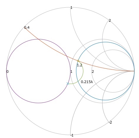 Paso 4. Se ubica sobre la carta tanto el lugar de puntos de igual como la intersección de este con el círculo de . Sobre la escala exterior de la carta de Smith se lee la longitud del stub en unidades de λ. Al completar este paso el programa adap1stub.m devuelve el diagrama que se muestra en la Figura 6 indicando, además, el valor de en unidades de .