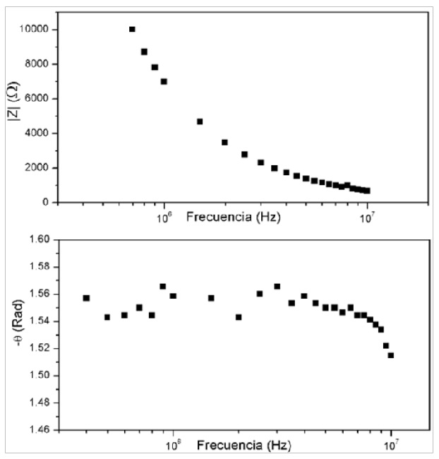 Celda. La celda consiste en un bloque rectangular de teflón, con un sistema de refrigeración y con electrodos de acero inoxidable en su interior de área 55 x 105 mm2 separados por 5,5 mm. La capacidad del condensador Co resulta ser 8,79 pF. En la Figura 1 se grafica el módulo de la impedancia del condensador o celda en función de la frecuencia para un rango entre 400 kHz y 10 MHz, la celda se comporta como un condensador ideal hasta una frecuencia de 4,7 MHz. El módulo de la impedancia decae como 1/ωCo y el ángulo es aproximadamente -π/2. Por encima de 4,7 MHz el ángulo comienza a disminuir debido a efectos inductivos. Debido a este efecto las medidas realizadas en las emulsiones están comprendidas en ese rango.