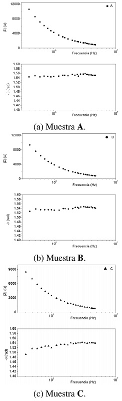 En las Figuras 2a, 2b y 2c se muestran los diagramas de Bode de las tres muestras en un rango de frecuencias entre los 400 kHz y 4,7 MHz. En las tres gráficas se observa como el módulo de la impedancia disminuye a medida que aumenta la frecuencia y también disminuye con el aumento del volumen de agua; el ángulo de fase aumenta a medida que aumenta la frecuencia tendiendo a -π/2, dándole características capacitivas al conjunto celda-fluido.