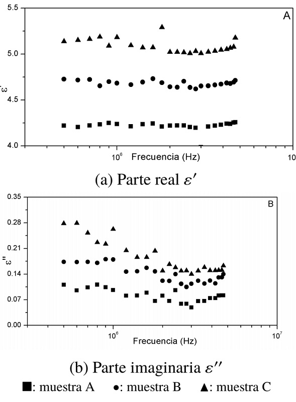 En la Figura 3 se grafica la parte real (ε') e imaginaria (ε'') de la permitividad eléctrica en función de la frecuencia. Los datos de las gráficas se obtienen a partir de las ecuaciones (1) y (2). La parte real de la permitividad eléctrica de las tres emulsiones presentan un comportamiento prácticamente constante en todo el rango de frecuencias. Para las muestras A, B y C se obtiene un valor para la parte real de la permitividad eléctrica de alrededor de 4,28, 4,84 y 5,32, respectivamente. Se observa un aumento de (ε') con el aumento de la fracción volumétrica de agua.