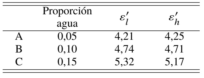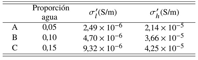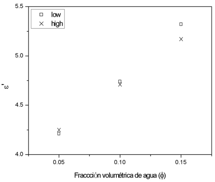En la Figura 4 se grafican los datos de la Tabla 2; la parte real de la permitividad eléctrica ε' para la frecuencia más baja del rango estudiado (400 kHz) εl' y a alta frecuencia (4,7 MHz) εh' en función de la fracción volumétrica de agua . Se observa un aumento de ε'l y ε'h con el aumento de la fracción volumétrica de agua. Para = 0,05 los valores de ε'l y ε'h son muy cercanos. Para = 0,1ε'l es un poco mayor que ε'h y para = 0,15 la diferencia entre ε'l y ε'h es aun mayor de acuerdo con la teoría de Wagner [3]. Ésta predice que para bajas fracciones volumétricas de agua menores a 0,2 ε'l y ε'h tienen comportamientos similares y a medida que aumenta , ε'l crece más rápido que ε'h. Esto se debe a que la parte real de la permitividad eléctrica disminuye al aumentar la frecuencia, disminuyendo la contribución a la permitividad compleja que se caracteriza frecuentemente con el nombre de constante dieléctrica.