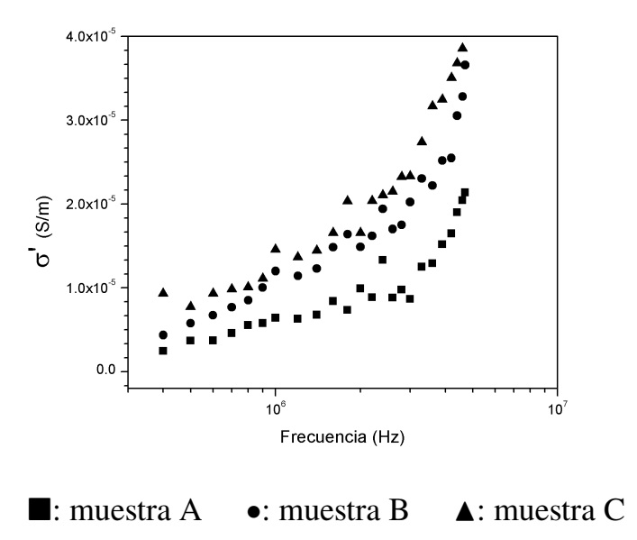 En la Figura 5 se grafican los datos obtenidos a través de la ecuación (3) para cada una de las emulsiones. Se observa que la conductividad crece a medida que aumenta la frecuencia, siendo mayores los valores de conductividad a medida que aumenta la fracción volumétrica de agua .