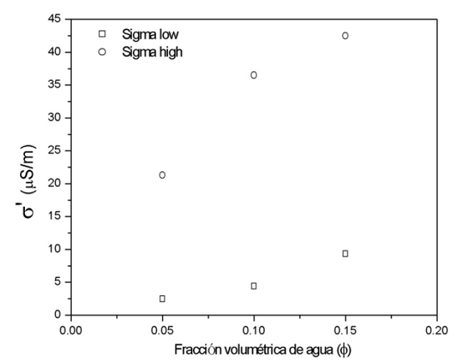 En la Figura 6 se grafica la conductividad para los límites de baja σl' y alta frecuencia σh' . Se observa como σl' y σh' aumentan con el incremento de la fracción volumétrica de agua, siendo mayor las conductividades para el límite de alta frecuencia de acuerdo con la teoría de Wagner, la cual predice que para una frecuencia de excitación mayor que 1/τ disminuye la contribución de la permitividad como constante dieléctrica o polarización dieléctrica, y comienzan a tener mayor importancia los efectos conductivos. En la Tabla 3 se muestran los valores de la parte real de la conductividad eléctrica en el límite de baja y alta frecuencia σh' y σl' de las tres emulsiones [3].